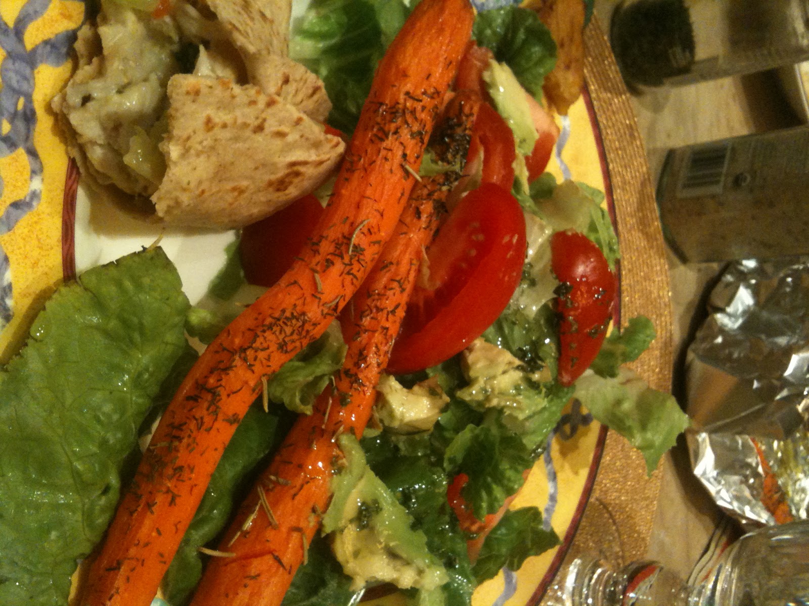 -Cucumber, Tomato, Hummus, Cilantro, Parsley, Garlic Salt, Brown Rice, and Roasted Rosemary Carrot and Avocado